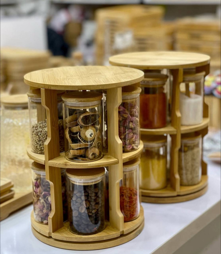 جا ادویه چوبی گردان ده عدد بانکه و همراه استند چوبی جا ادویه پیرکس درب چوبی